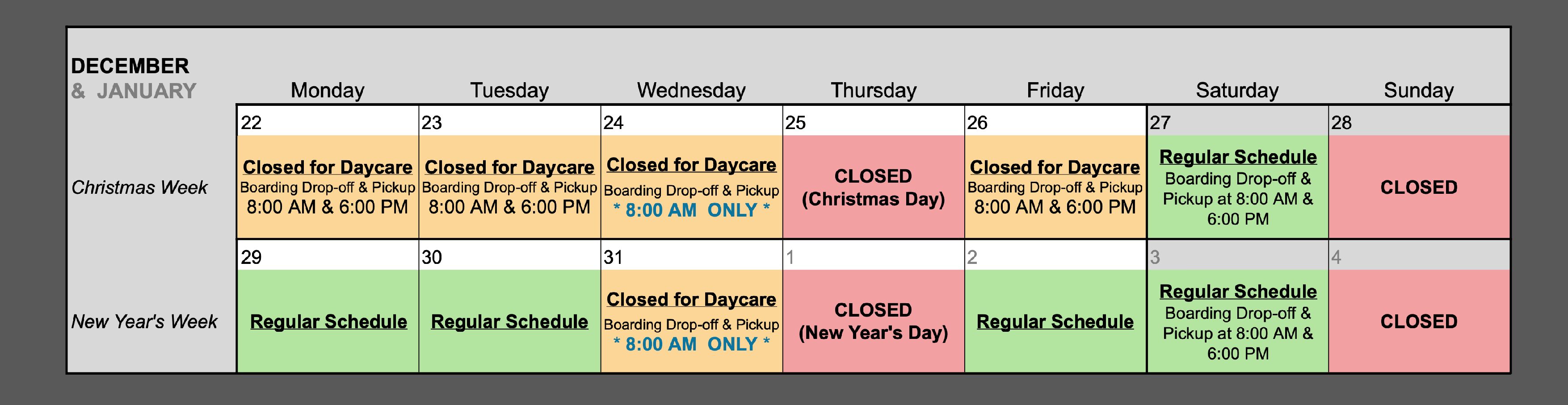 Mon 12/22 – Closed for daycare* | Boarding drop-off/pick-up at 8:00 AM / 6:00 PM